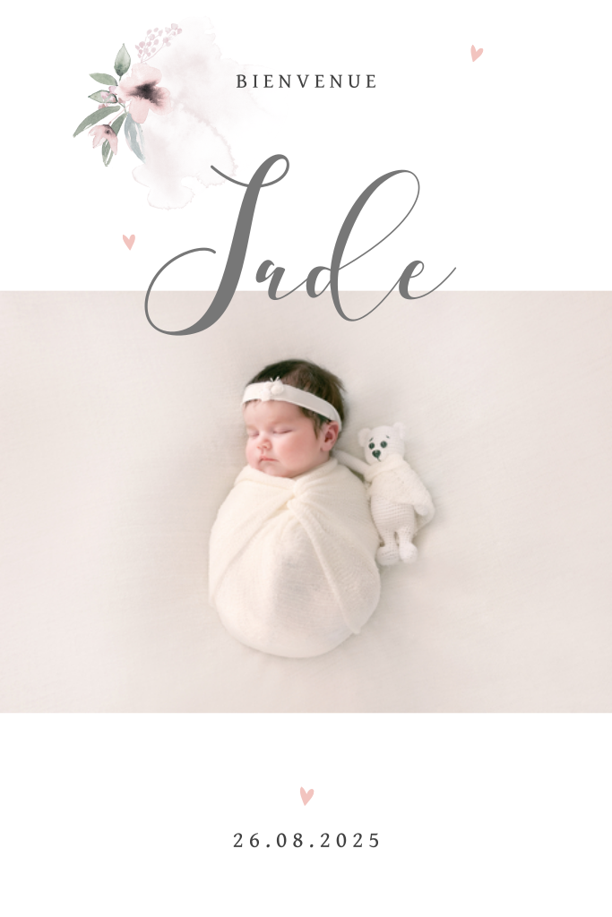 Faire-part de naissance avec fleurs en aquarelle et photo