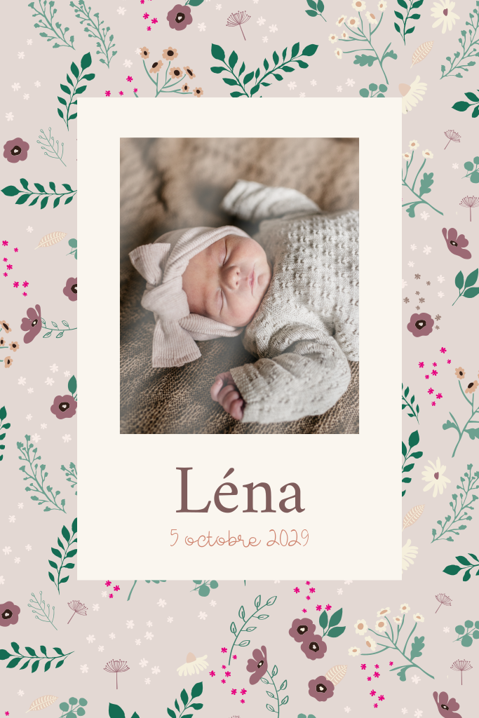 Faire-part de naissance avec fleurs, feuillages et polaroid
