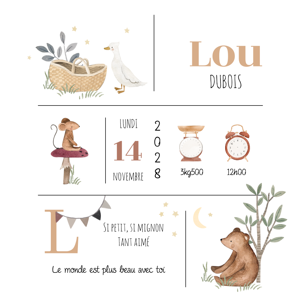 Faire-part de naissance avec de jolies illustrations d'animaux.