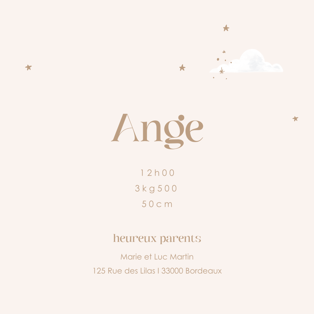 Faire-part de naissance avec lune, étoiles et nom en vernis.