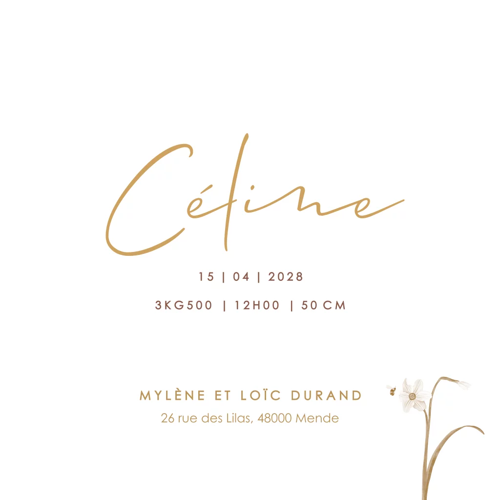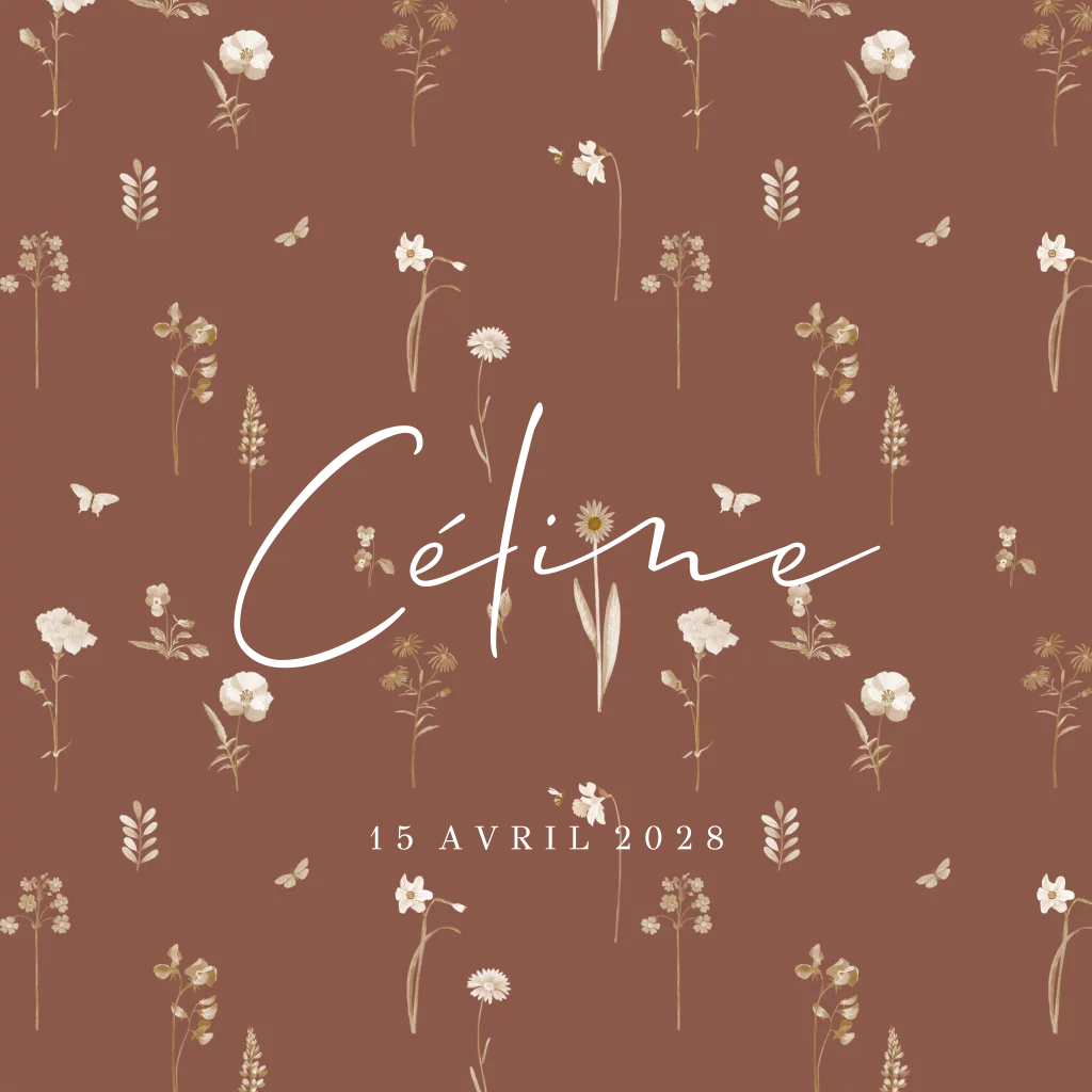 Faire-part de naissance marron avec dorures et fleurs beiges