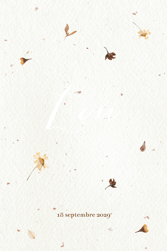 Faire-part de naissance avec nom en dorure sur fond avec fleurs séchées