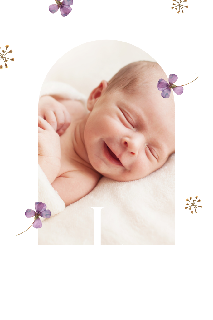 Faire-part de naissance avec photo, arche et violettes
