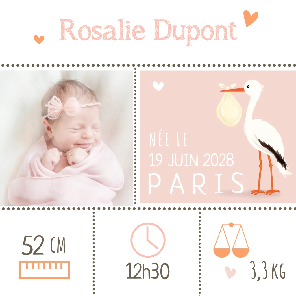 Joli faire-part de naissance ornée de cœurs, d'éléments de naissance roses, d'une illustration d'une cigogne et de votre propre photo !