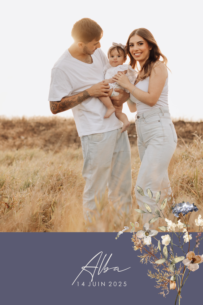 Faire-part de naissance avec photo sur fond violet et fleurs.