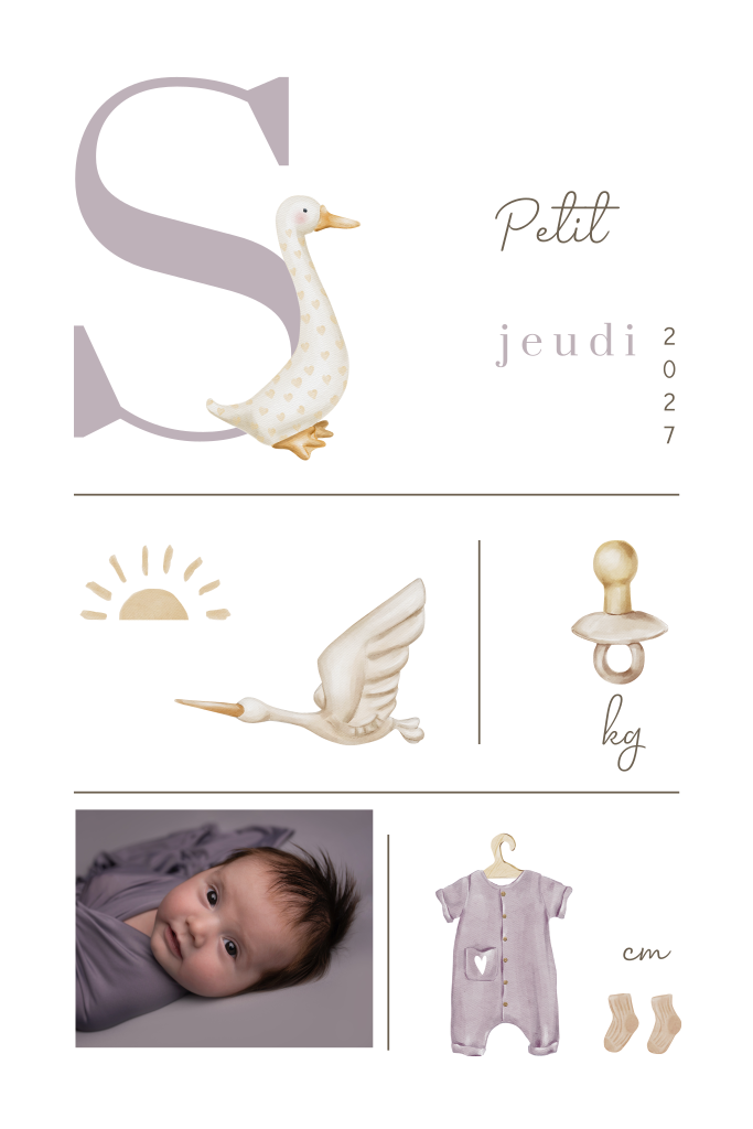 Faire-part de naissance avec photo, oie et éléments en lila