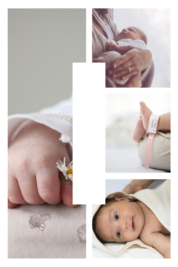 Faire-part simple et doux avec la possibilité de placer plusieurs photos. À l'avant, l'écriture est en dorure rosée.
