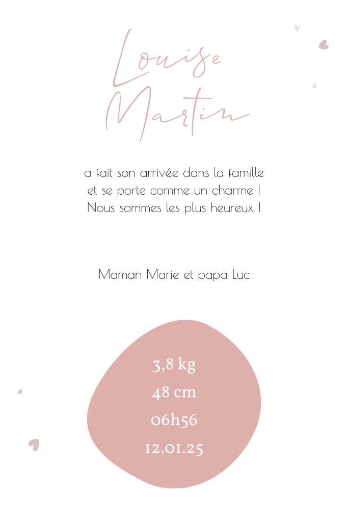 Faire-part de naissance avec photos, fleurs et petits cœurs.