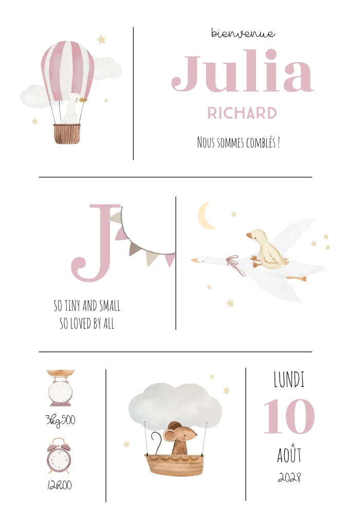 Faire-part de naissance en rose avec des illustrations d'animaux.