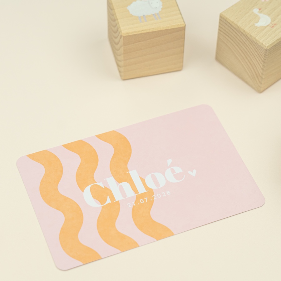 Faire-part de naissance avec des vagues orangées sur fond rose.