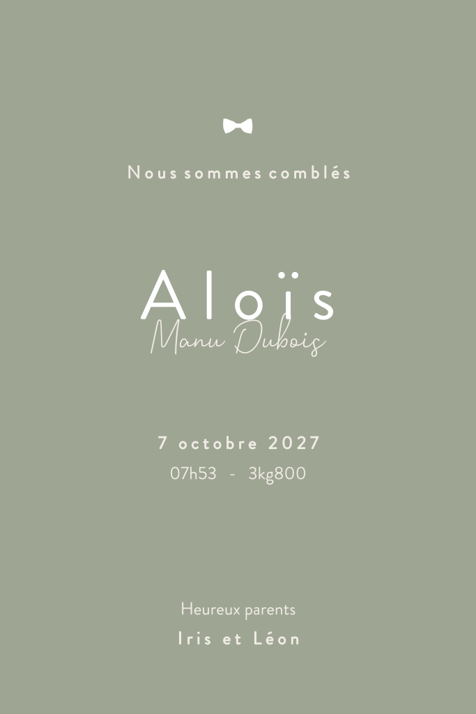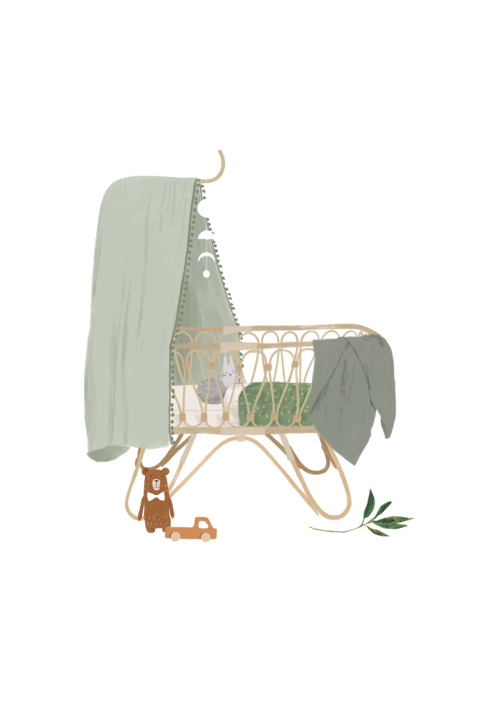 Faire-part de naissance avec berceau dans teintes vertes et nom en dorure