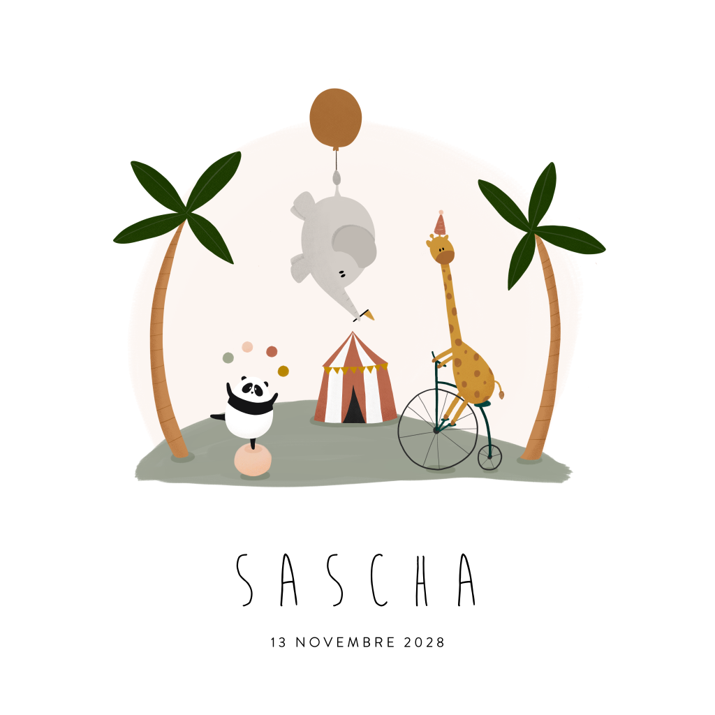 Faire-part de naissance avec des animaux du cirque : éléphant, panda et girafe. A l'intérieur, vous pouvez facilement ajouter la photo de votre enfant.