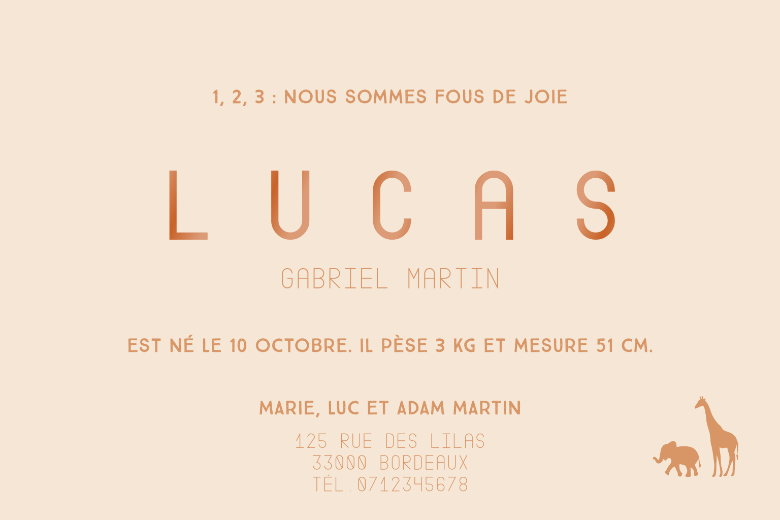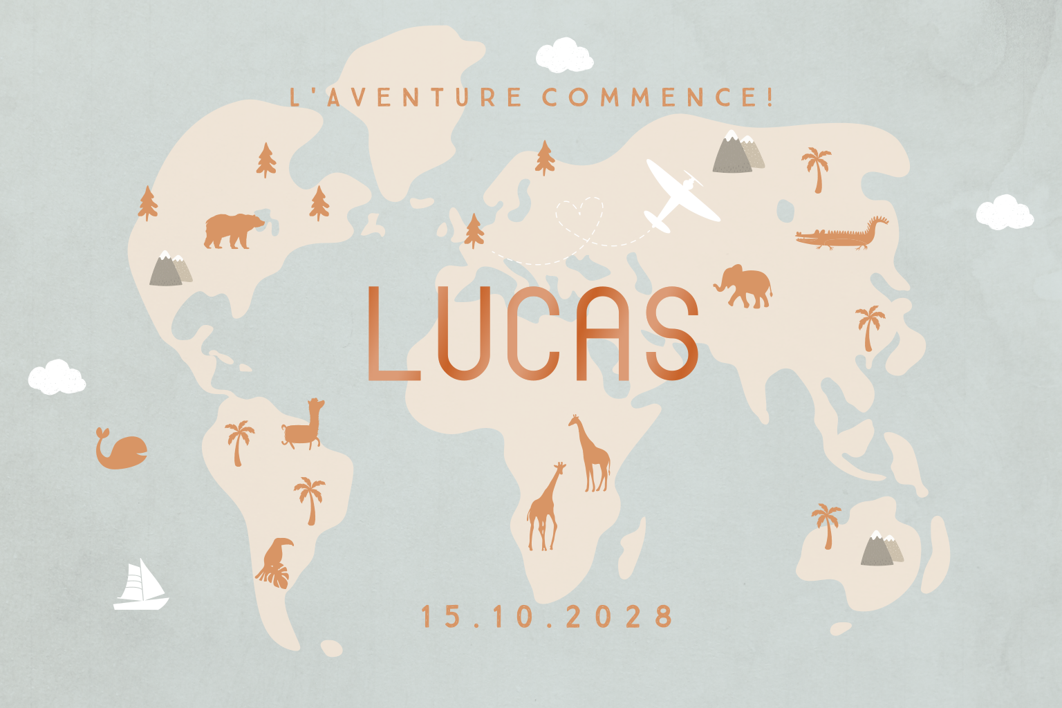 Faire-part de naissance avec carte du monde et animaux.