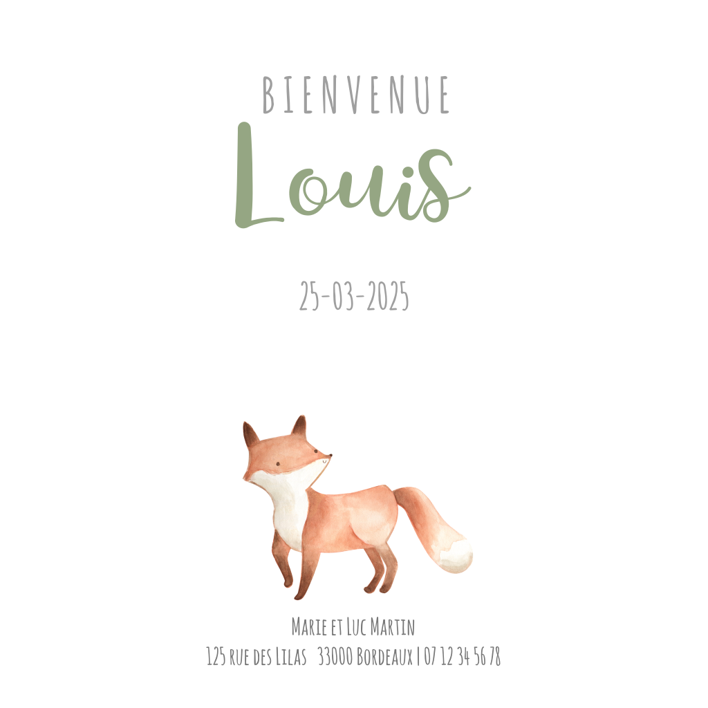 Faire-part de naissance avec dessin en aquarelle avec un renard