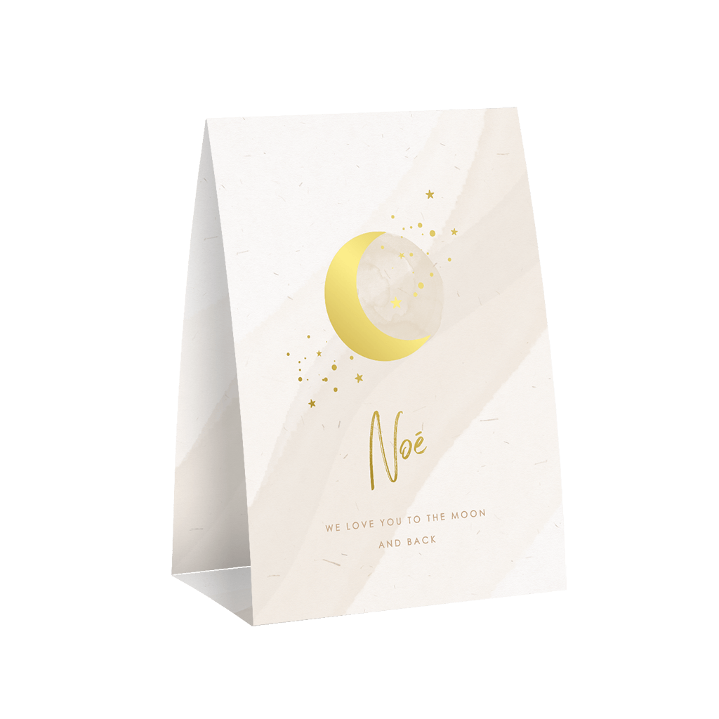Faire-part de naissance en forme de tente avec lune et étoile.