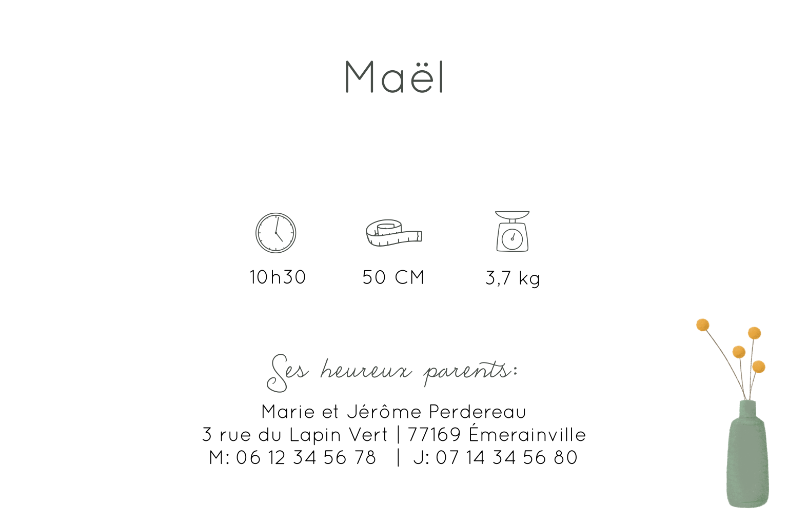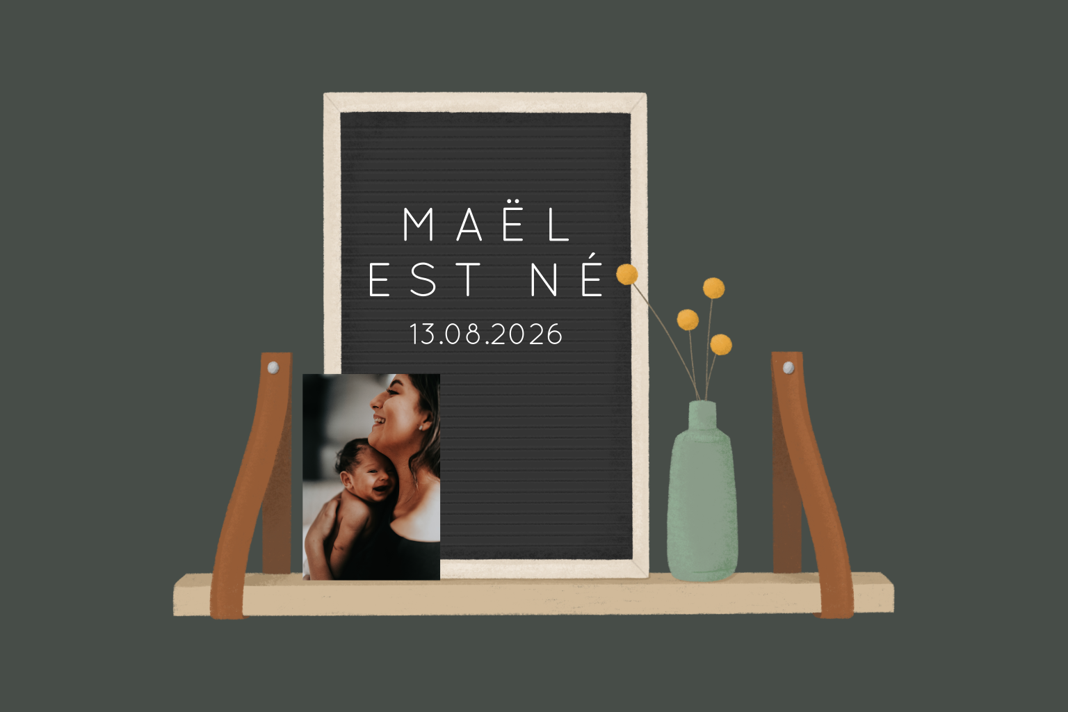 Un faire-part de naissance original et moderne mêlant illustration et photographie. Il met en scène sur une étagère: le prénom de bébé et sa date de naissance affichés sur un tableau à lettres, une véritable photo à remplacer par la vôtre, et quelques fleurs jaunes dans un vase pour une touche de couleur et de fraîcheur. À l’intérieur de la carte, vous trouverez à gauche un charmant poème et un nouvel emplacement pour une photo ainsi qu'à droite toutes les informations essentielles sur la naissance de votre petit trésor avec des symboles, et un rappel de l’illustration.