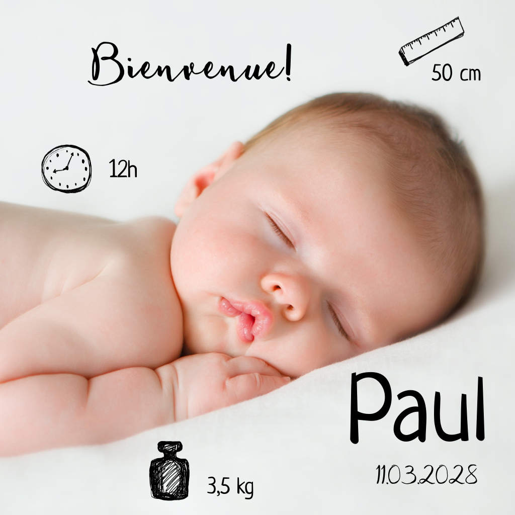 Envoyez ce faire-part de naissance moderne à vos amis et votre famille avec une photo de votre petit en arrière-plan ! Les icônes et les polices de caractères donnent la touche finale à cette carte.