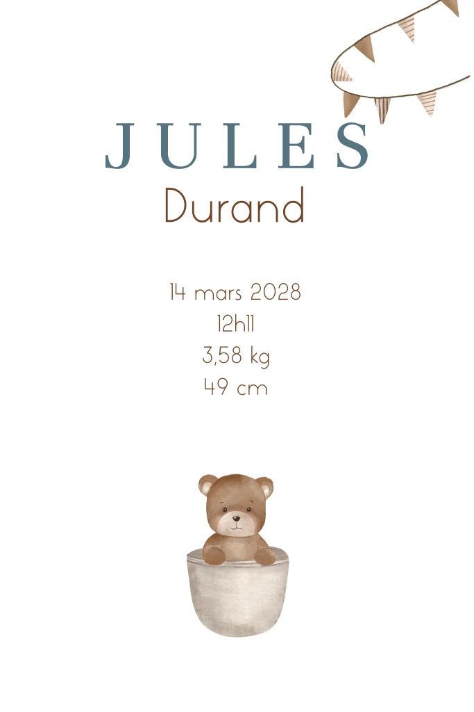 Faire-part de naissance avec montgolfière et ours sur fond bleu clair.