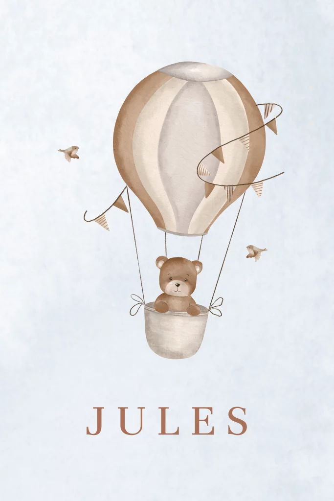 Faire-part de naissance avec montgolfière et ours sur fond bleu clair