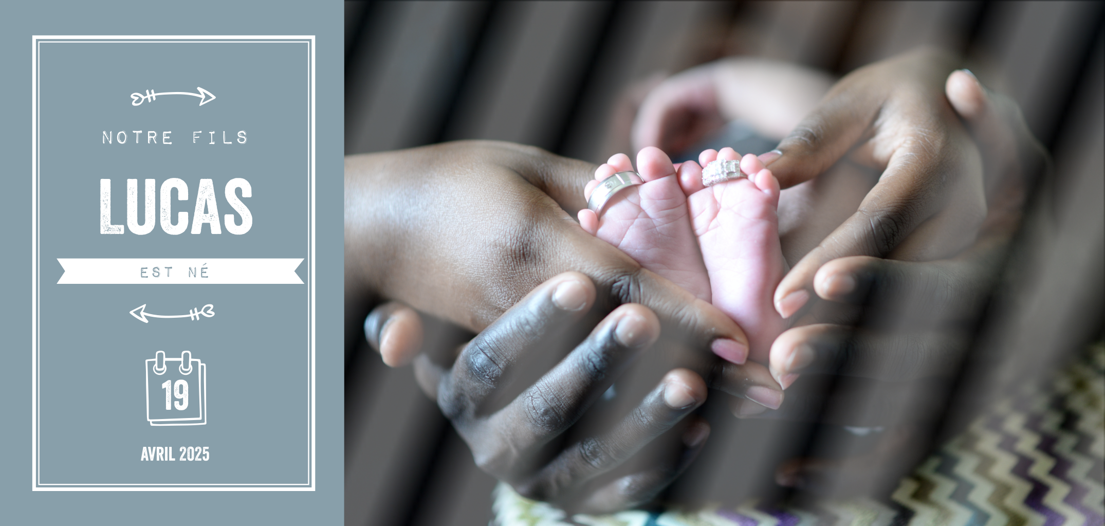 Cette carte très graphique format panoramique fait la part belle à une grande photo au recto. Au verso l’on retrouve toutes les informations de naissances accompagnées de symboles ludiques, ainsi que votre texte personnalisé et vos coordonnées sur un fond bleu-gris moderne et élégant.