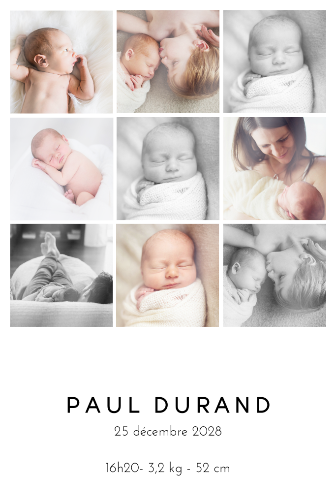 Beau faire-part de naissance avec un photo-collage. Il y a de la place pour neuf photos. Vous pouvez les modifier facilement dans l'éditeur en ligne.