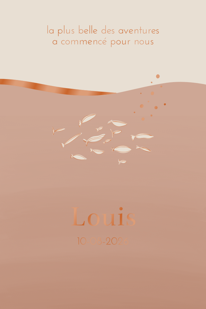 Faire-part de naissance avec une photo et des dessins de petits poissons.