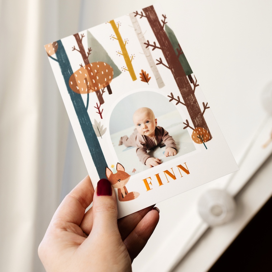 Faire-part de naissance avec photo, forêt et renard