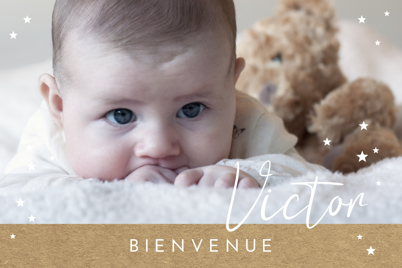 Faire-part naissance avec un une photo et des lettres en dorure.