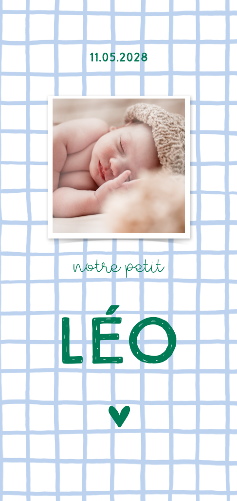 Faire-part de naissance avec polaroid et carreaux bleus.