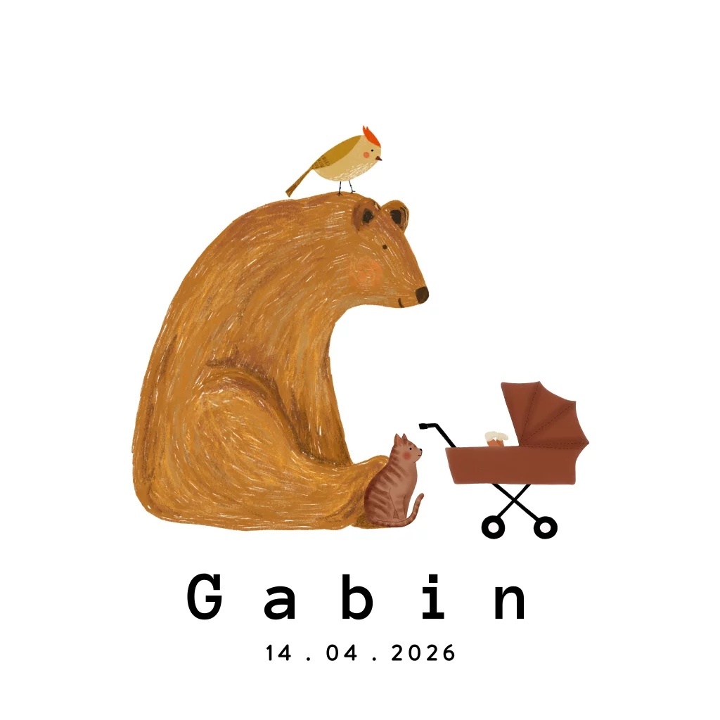 Simple et adorable ! Sur ce faire-part de naissance carré aux coins arrondis, un ours, un chat et un oiseau veillent sur bébé.