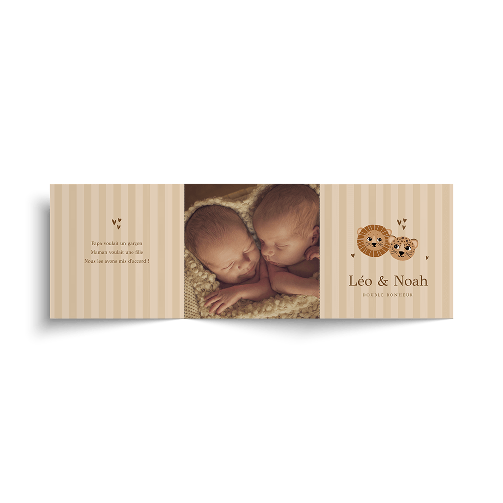 Faire-part de naissance jumeaux en accordéon avec animaux jungle