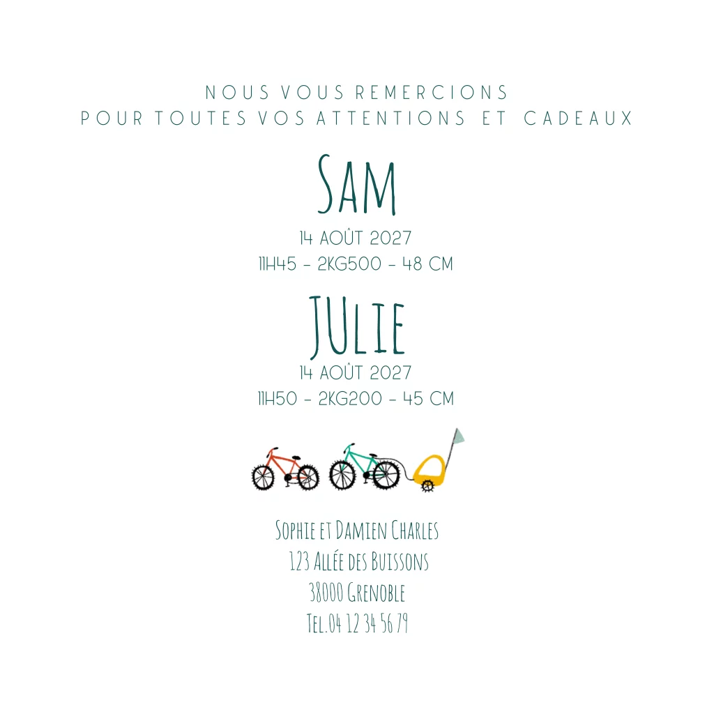 Faire-part de naissance avec montagnes et tente pour des jumeaux