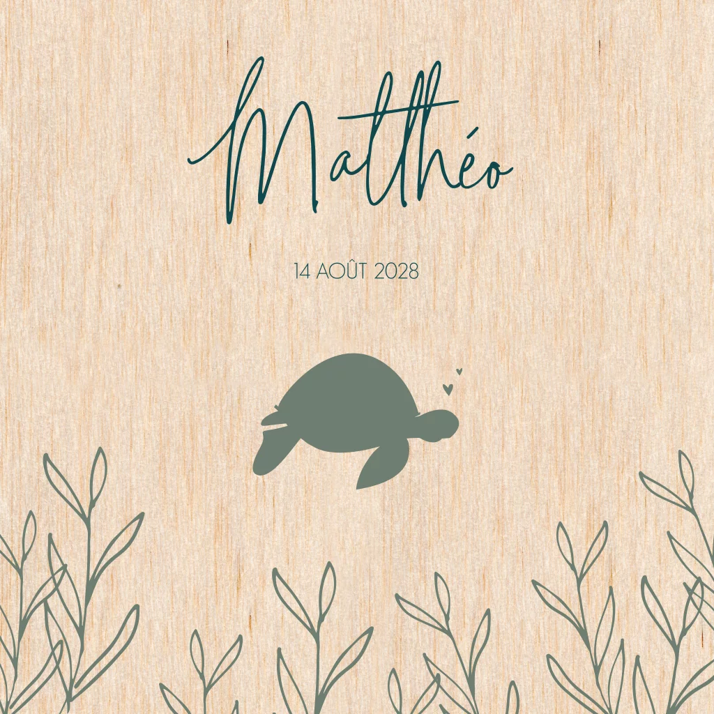 Faire-part de naissance sur bois avec tortue et feuilles.