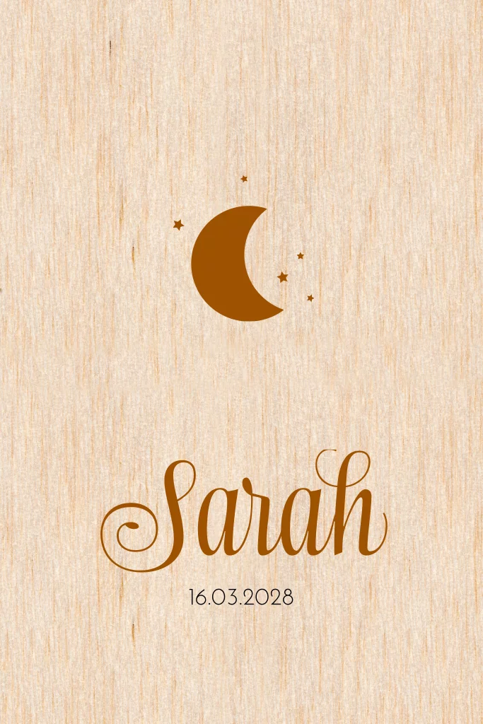 Faire-part de naissance élégant sur bois avec lune et étoiles.