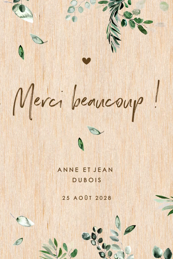 Carte de remerciement en bois avec des feuilles d'aquarelle