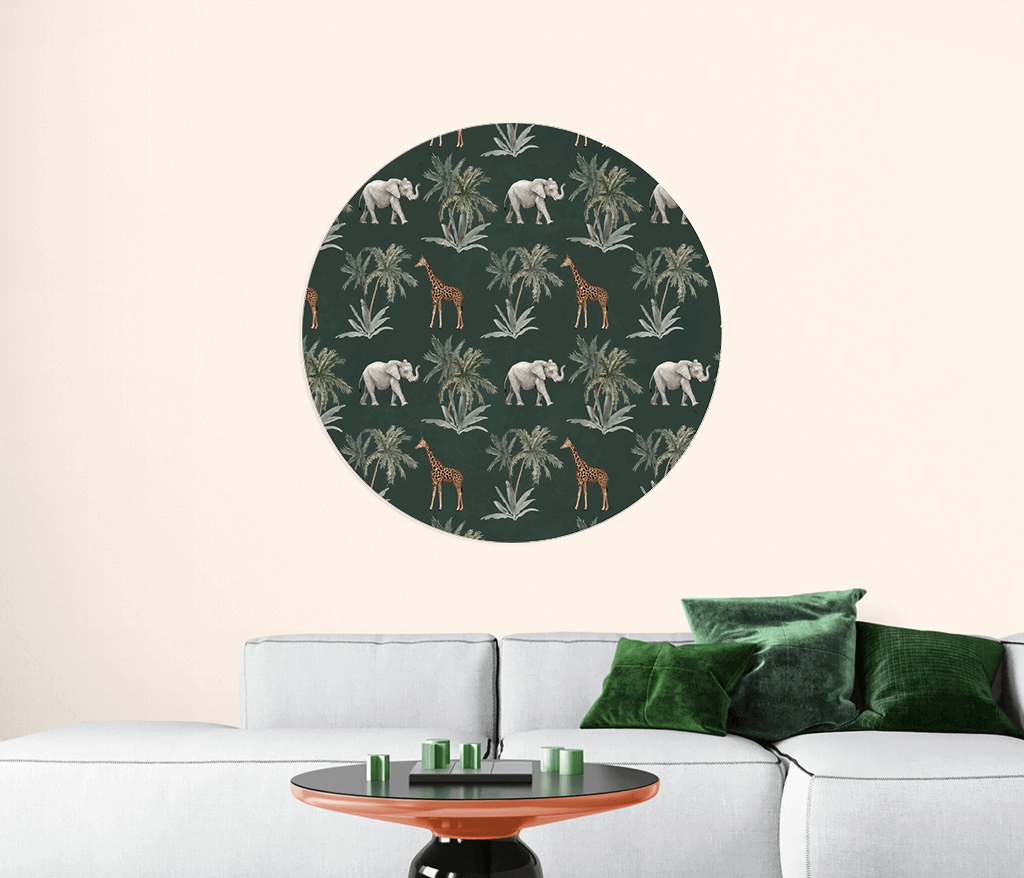 Papier peint rond avec des girafes, des éléphants et des palmiers