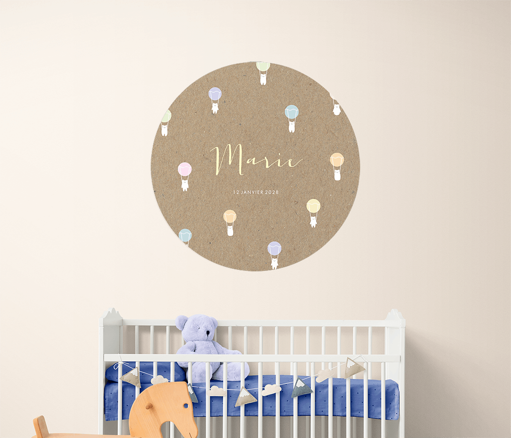Papier peint rond aspect kraft avec ours, ballons colorés et prénom