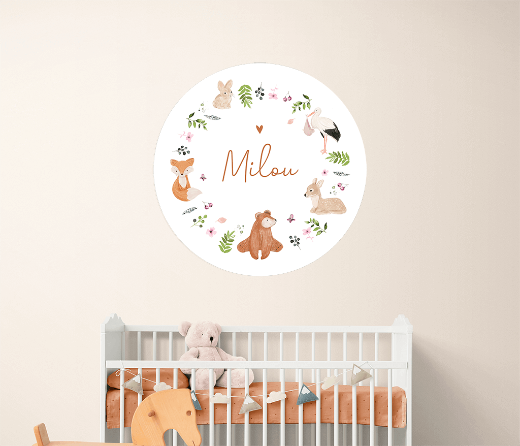 Papier peint rond avec des animaux, des fleurs et des feuillages