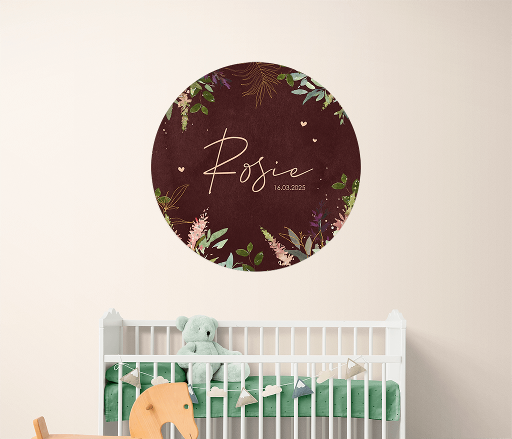 Papier peint rond avec fond marron, feuillages et pénom enfant