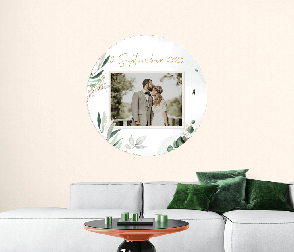 Papier peint rond avec feuillages, photo et texte