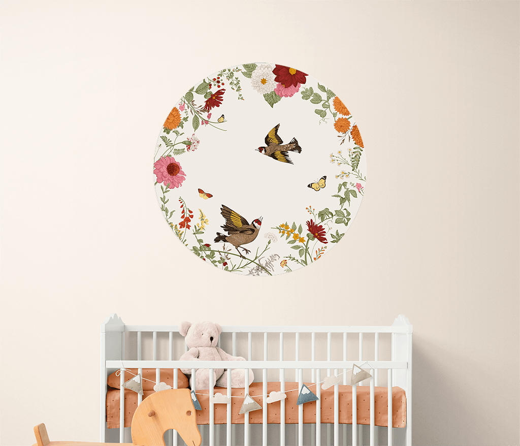 Papier peint rond avec des oiseaux et des fleurs printanières