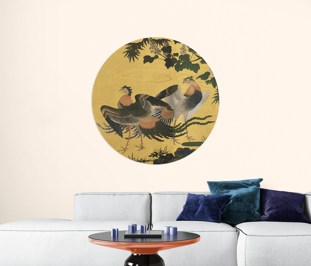 Papier peint rond avec des paons et des phénix de Tosa Mitsuyoshi