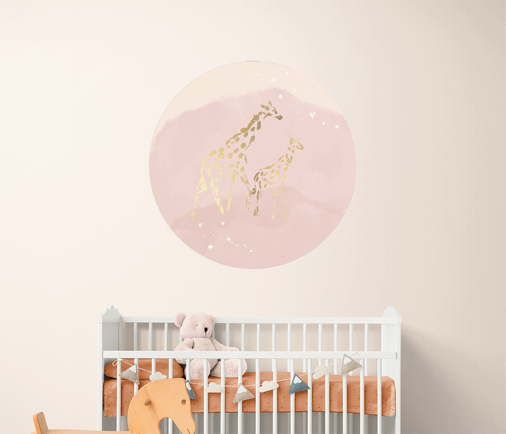 Papier peint rond avec fond rose poudré et des girafes jaune-or