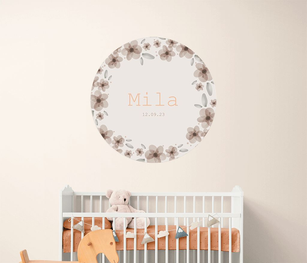 Papier peint rond avec des fleurs et des prénoms d'enfants de 100 cm de diamètre.