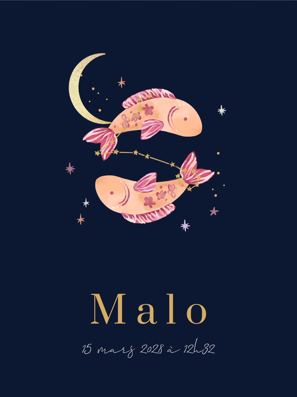 Affiche de naissance avec signe du zodiaque Poissons