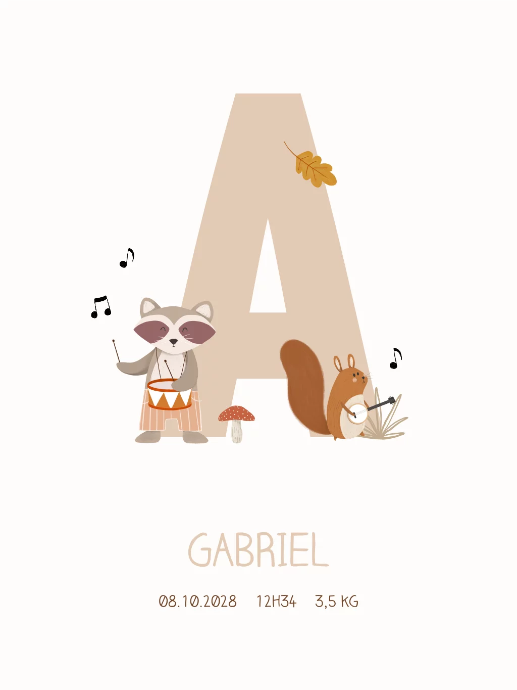 Affiche pour la chambre de bébé avec un raton laveur et un écureuil