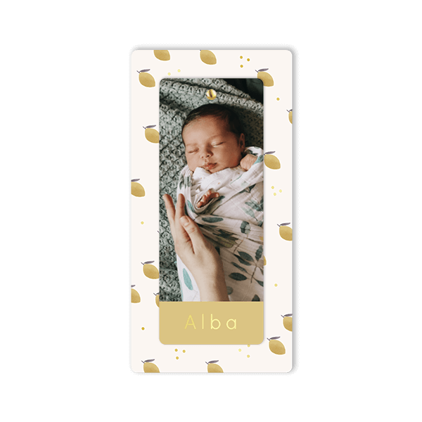 Faire-part de naissance avec citrons, étiquette et nom doré