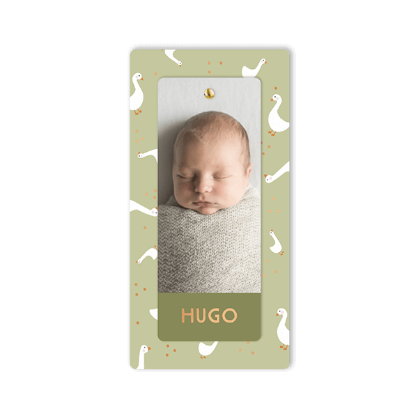 Faire-part de naissance avec oies, photo et fond vert