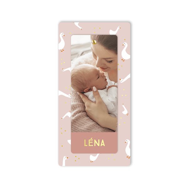 Faire-part de naissance avec des oies, photo et nom en dorure