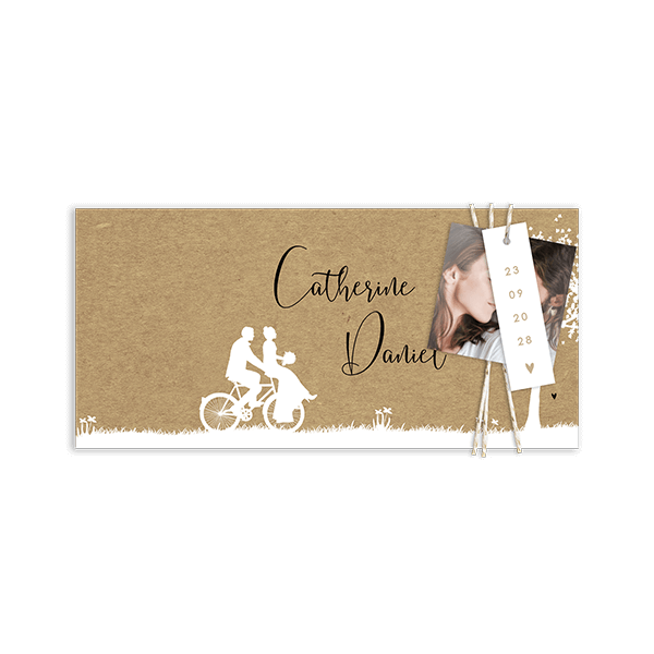 Faire-part avec couple sur vélo, et fond aspect kraft